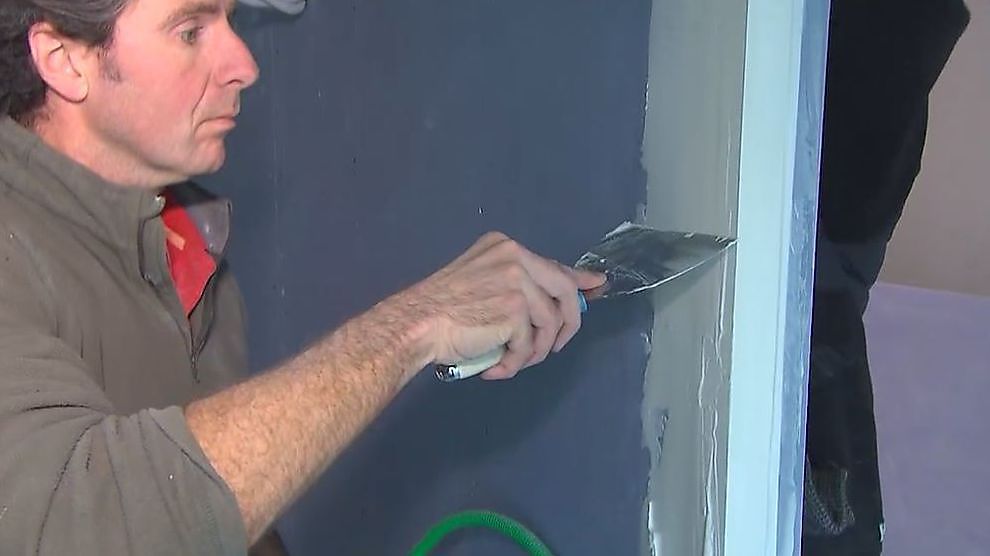 Aan weerszijden van de buitenhoek brengen we daarvoor plamuur aan, zodat we daar de band mee kunnen vastkleven.