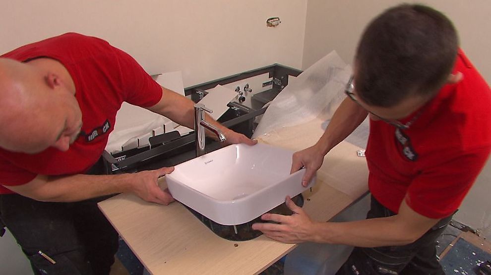 Nu kan je beginnen met het werkblad van je wasmeubel. Om makkelijk te werken monteren we er eerst al de wasbakken en het kraanwerk op vast.